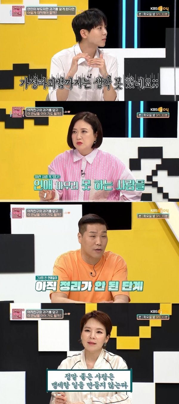 이후 여자친구는 자신의 과거가 어떻든 사랑해 달라고 했고, 고민남 역시 여전히 여자친구를 사랑하기에 그녀를 믿고 싶다고 털어놨다. 이에 김숙은 "지금 고민남은 있지도 않았던 과거에 얽혀있다. 연인 두 사람만의 사건사고도 풀기 힘든데 고민남은 여자친구 전 연인과 전전 연인의 매듭까지 풀어야 한다. 이 연애는 말리고 싶다"라며 현실을 바라보게 했다.