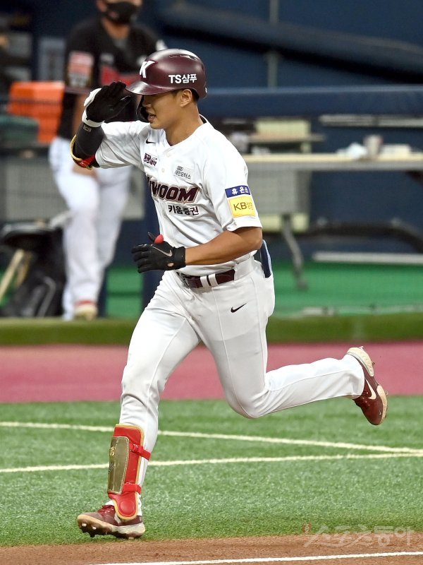 1회말 1사 1루 키움 송성문이 우중월 투런 홈런을 날린 후 그라운드를 돌며 기뻐하고 있다.