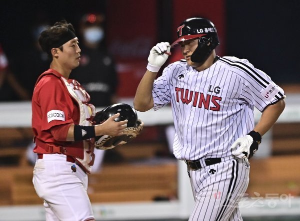 4회말 1사 LG 이재원이 중월 백투백 홈런을 쳐낸 뒤 그라운드를 돌고 있다.