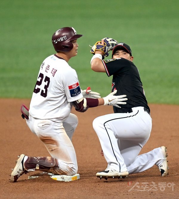 6회말 2사 키움 박준태가 좌전 안타를 치고 2루까지 달렸으나 아웃되고 있다.