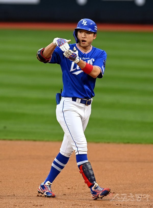 1회초 무사에서 삼성 박해민이 안타를 날린 뒤 세리머니를 펼치고 있다.