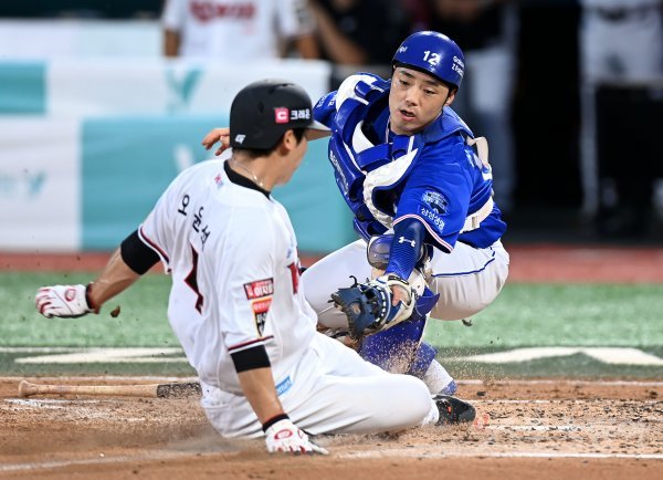 2회말 1사 2, 3루에서 kt 내야 땅볼 때 삼성 김민수가 홈으로 파고들던 오윤석에게 태그를 시도하고 있다.