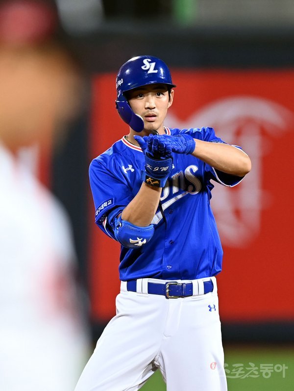 4회초 1사 1, 2루에서 삼성 구자욱이 1타점 2루타를 날린 뒤 세리머니를 펼치고 있다.