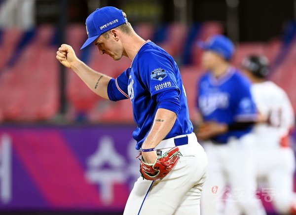 삼성 선발 뷰캐넌이 5회까지 kt 공격을 2실점으로 막은 뒤 이닝 종료 후 주먹을 쥐며 환호하고 있다.