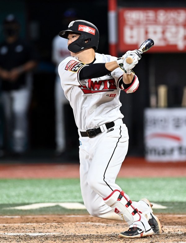 7회말 2사 1, 3루에서 kt 오윤석이 1타점 적시타를 날리고 있다.