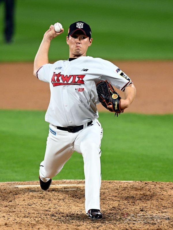 8회초 2사 1루에서 kt 김재윤이 구원 등판해 볼을 던지고 있다.