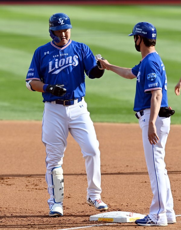 15일 경기도 수원 kt위즈파크에서 ‘2021 신한은행 SOL KBO리그’ kt 위즈와 삼성 라이온즈의 경기가 열렸다. 1회초 1사 1, 3루에서 삼성 오재일이 1타점 적시타를 날린 뒤 코치의 환영을 받고 있다.