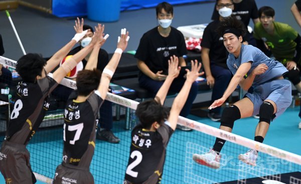 16일 경기도 의정부체육관에서 열린 ‘2021 의정부·도드람컵 프로배구대회’ 남자부 현대캐피탈과 OK금융그룹 경기에서 현대캐피탈 최은석이 OK금융그룹의 블로킹 사이로 스파이크를 날리고 있다.