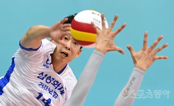 16일 경기도 의정부체육관에서 열린 ‘2021 의정부·도드람컵 프로배구대회’ 남자부 삼성화재와 한국전력 경기에서 삼성화재 정수용이 한국전력의 블로킹 사이로 스파이크를 날리고 있다.