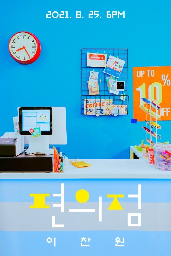 커밍순 이미지에는 편의점의 텅 빈 계산대가 담겨 있다. 청량한 블루 색감의 벽면을 배경으로 벽시계와 세일 포스터, 계산기 등 여러 소품의 강렬한 색상이 돋보인다. 계산대 위로 놓여 있는 디저트와 함께 신곡명이 발랄한 느낌의 폰트로 적혀 있어 눈길을 끈다. 이미지가 주는 아기자기하면서 사랑스러운 매력은 기분 좋은 에너지를 선사하고 있어 이찬원이 새롭게 선보일 ‘편의점’에 대한 궁금증을 높이고 있다.