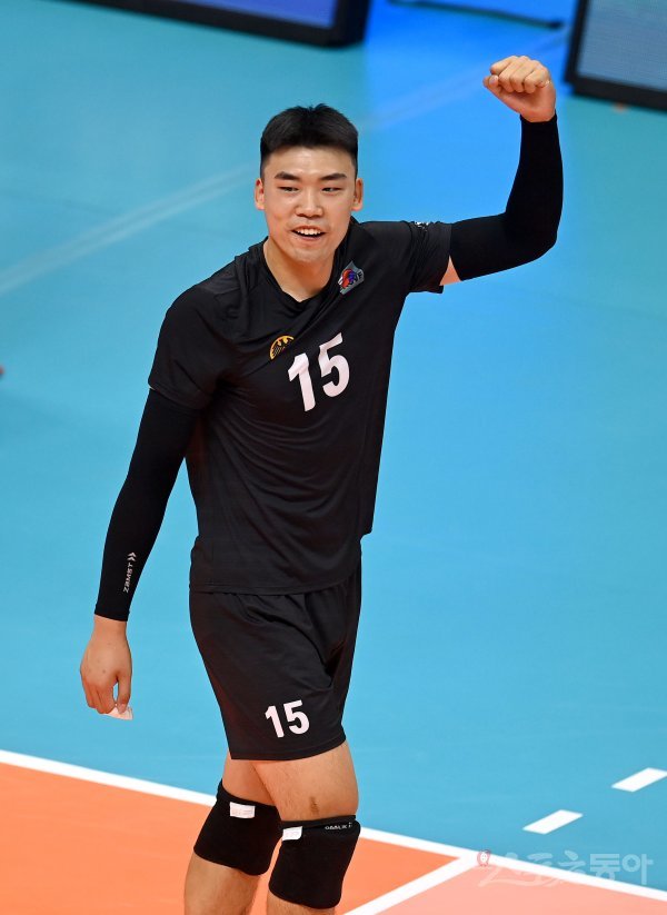 17일 경기도 의정부체육관에서 열린 ‘2021 의정부·도드람컵 프로배구대회’ 남자부 우리카드와 국군체육부대 경기에서 국군체육부대 한국민이 3세트를 가져오는 득점에 성공한 후 기뻐하고 있다.