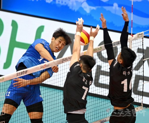 17일 경기도 의정부체육관에서 열린 ‘2021 의정부·도드람컵 프로배구대회’ 남자부 우리카드와 국군체육부대 경기에서 우리카드 한성정이 국군체육부대의 블로킹 사이로 스파이크를 날리고 있다.