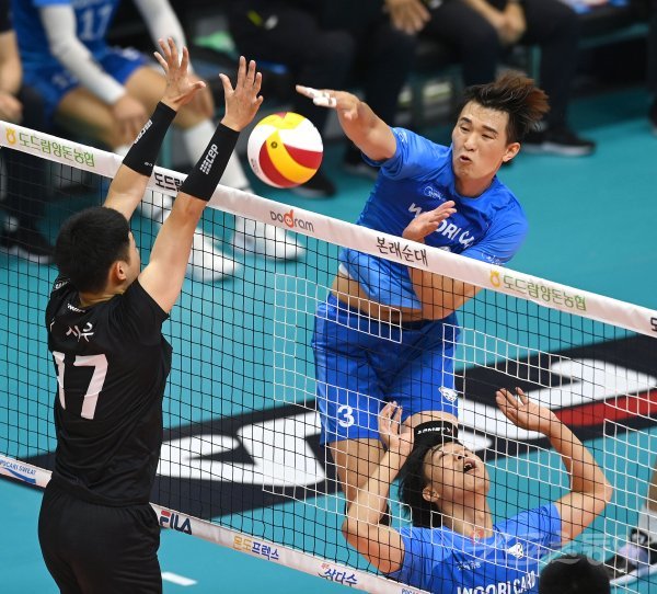17일 경기도 의정부체육관에서 열린 ‘2021 의정부·도드람컵 프로배구대회’ 남자부 우리카드와 국군체육부대 경기에서 우리카드 최석기가 국군체육부대의 블로킹 사이로 스파이크를 날리고 있다.