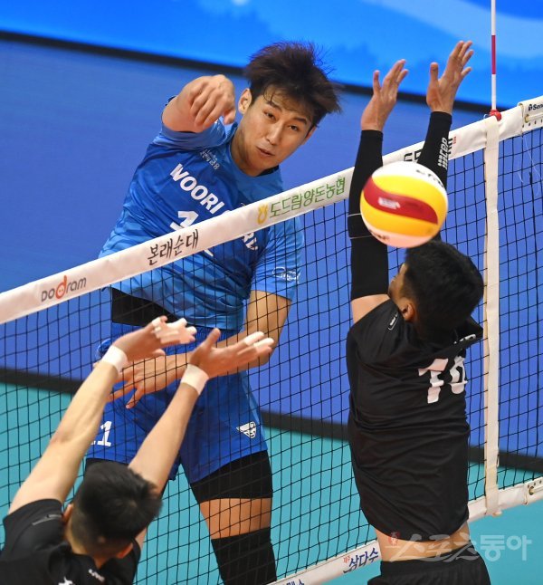 17일 경기도 의정부체육관에서 열린 ‘2021 의정부·도드람컵 프로배구대회’ 남자부 우리카드와 국군체육부대 경기에서 우리카드 한성정이 국군체육부대의 블로킹 사이로 스파이크를 날리고 있다.