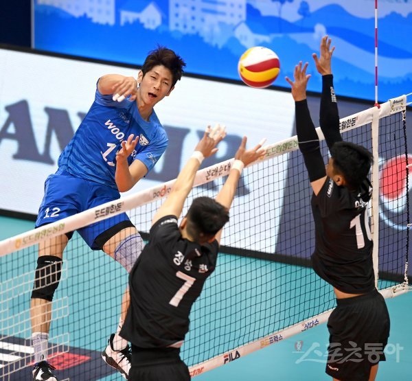 17일 경기도 의정부체육관에서 열린 ‘2021 의정부·도드람컵 프로배구대회’ 남자부 우리카드와 국군체육부대 경기에서 우리카드 류윤식이 국군체육부대의 블로킹 사이로 스파이크를 날리고 있다.