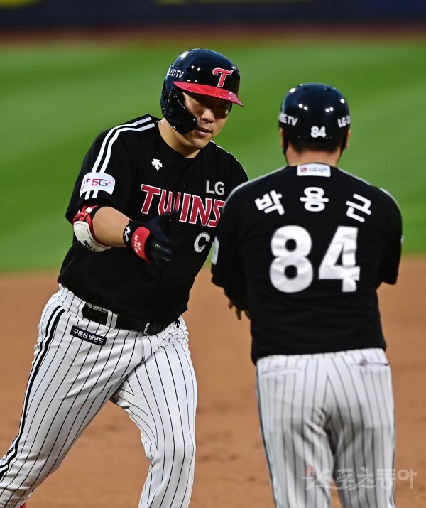 1회초 1사 LG 김현수가 우월 선제 솔로 홈런을 쳐낸 뒤 3루코치와 기쁨을 나누고 있다.