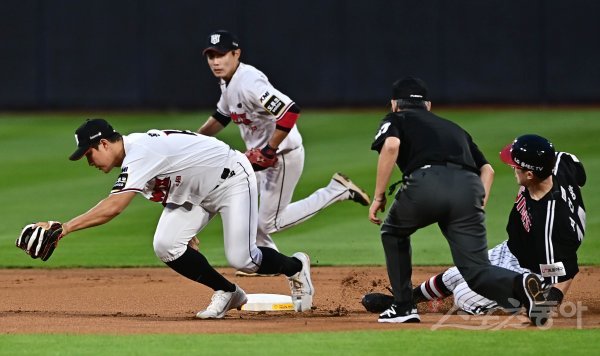 1회초 1사 1루 상황에서 KT 3루수 황재균이 LG 1루주자에게 도루를 허용하고 있다.
