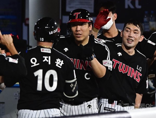 7회초 1사 2루 LG 오지환이 우월 2점 홈런을 쳐낸 뒤 더그아웃에서 김현수와 서건창의 축하를 받고 있다.