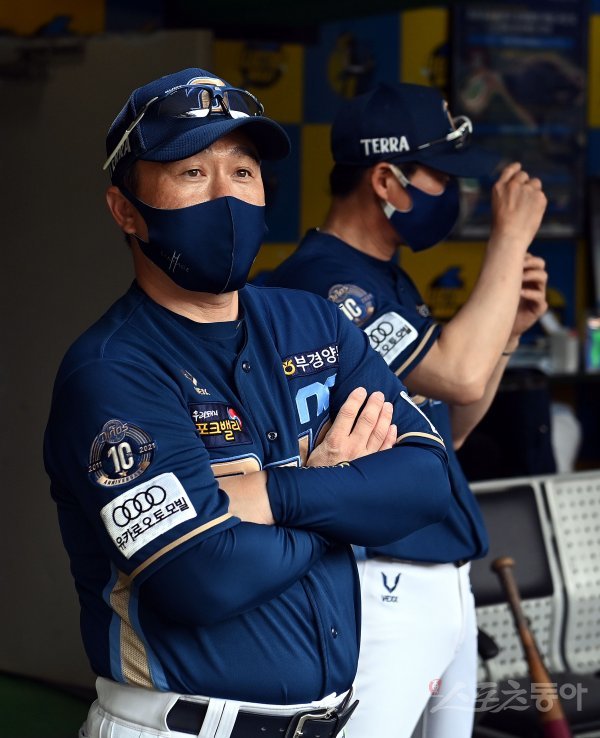 경기 전 우천으로 인해 경기가 지연되자 NC 이동욱 감독이 그라운드를 바라보고 있다.