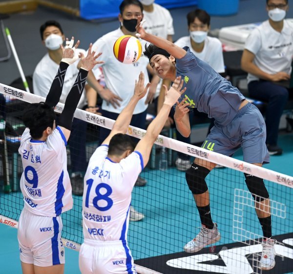 18일 경기도 의정부체육관에서 열린 ‘2021 의정부·도드람컵 프로배구대회’ 남자부 A조 현대캐피탈과 삼성화재 경기에서 현대캐피탈 최은석이 삼성화재의 블로킹 사이로 스파이크를 날리고 있다.