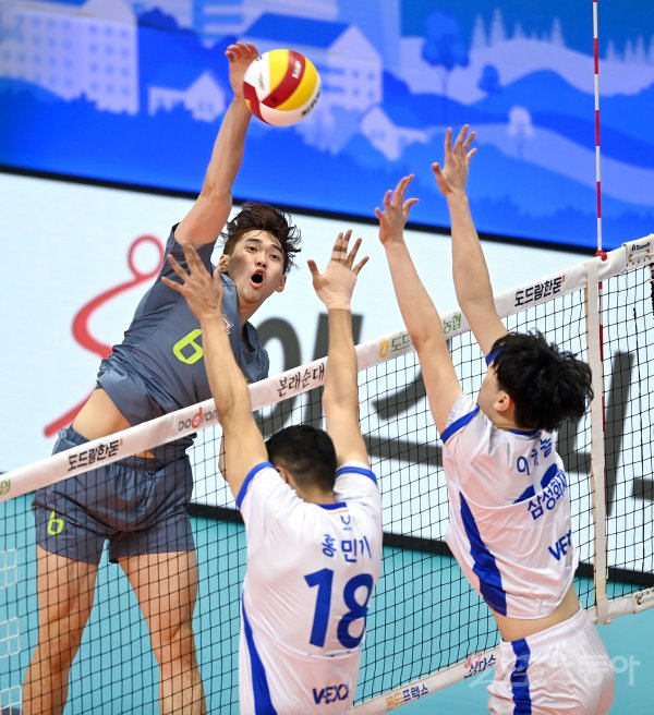 18일 경기도 의정부체육관에서 열린 ‘2021 의정부·도드람컵 프로배구대회’ 남자부 A조 현대캐피탈과 삼성화재 경기에서 현대캐피탈 김선호가 삼성화재의 블로킹 사이로 스파이크를 날리고 있다.