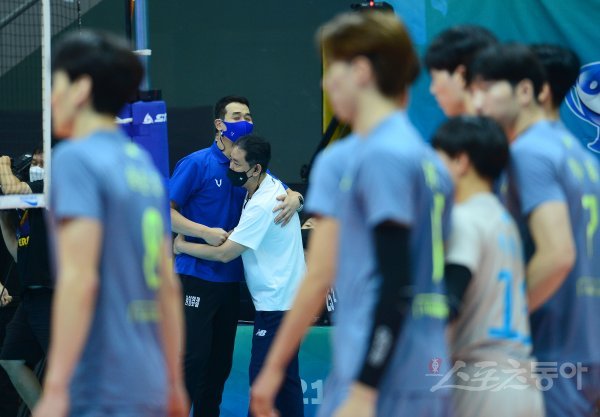 18일 경기도 의정부체육관에서 열린 ‘2021 의정부·도드람컵 프로배구대회’ 남자부 A조 현대캐피탈과 삼성화재 경기에서 현대캐피탈이 세트스코어 3-0 완승을 거뒀다. 경기 종료 후 삼성화재 고희진 감독과 현대캐피탈 최태웅 감독이 포웅을 하고 있다.