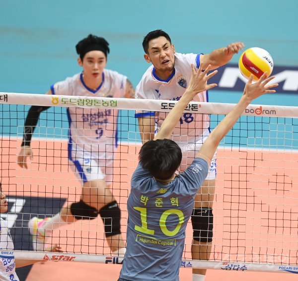 18일 경기도 의정부체육관에서 열린 ‘2021 의정부·도드람컵 프로배구대회’ 남자부 A조 현대캐피탈과 삼성화재 경기에서 삼성화재 홍민기가 현대캐피탈의 블로킹 사이로 스파이크를 날리고 있다.