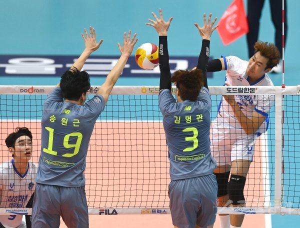 18일 경기도 의정부체육관에서 열린 ‘2021 의정부·도드람컵 프로배구대회’ 남자부 A조 현대캐피탈과 삼성화재 경기에서 삼성화재 고준용이 현대캐피탈의 블로킹 사이로 스파이크를 날리고 있다.