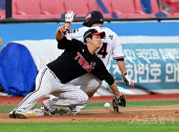 2회말 1사 1루에서 LG 문보경이 송구 실책을 잡지 못하고 있다.