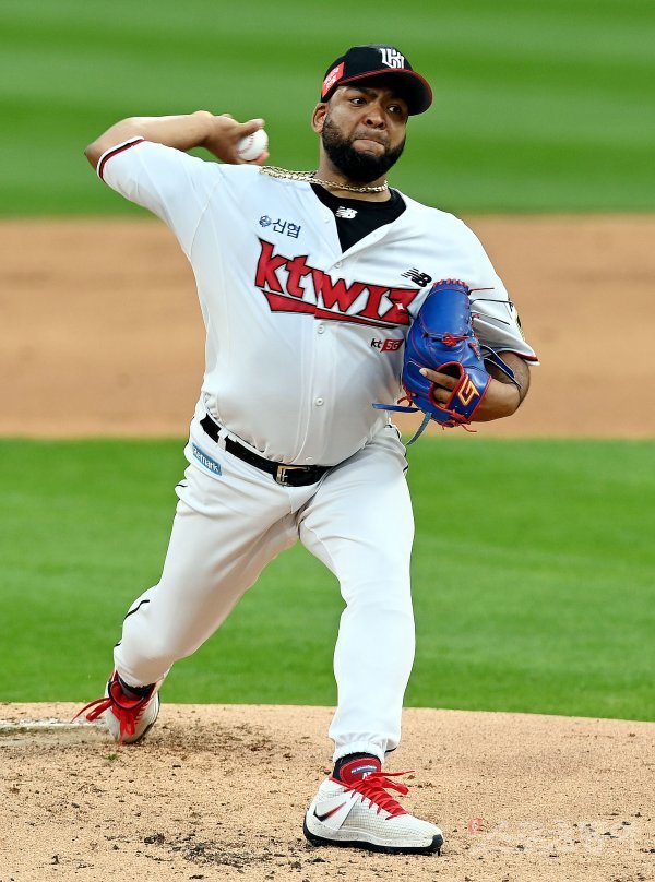 kt 선발투수 데스파이네가 힘차게 볼을 던지고 있다.
