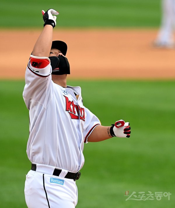 1회말 1사 1루에서 kt 강백호가 투런 홈런을 쏘아 올린 뒤 그라운드를 돌며 세리머니를 펼치고 있다.