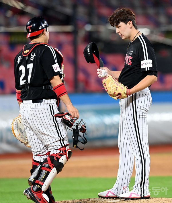 4회말 1사 1, 2루에서 LG 선발 이민호가 교체되고 있다.