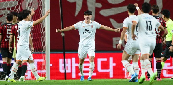 18일 서울월드컵경기장에서 열린 ‘하나원큐 K리그1 2021’ FC 서울과 제주 유나이티드의 경기에서 전반전에 제주 김봉수가 선제골을 성공시킨 뒤 동료들과 세리머니를 하고 있다.