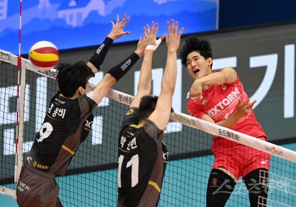 18일 경기도 의정부체육관에서 열린 ‘2021 의정부·도드람컵 프로배구대회’ 남자부 A조 한국전력과 OK금융그룹 경기에서 한국전력 김동영이 OK금융그룹의 블로킹 사이로 스파이크를 있다.