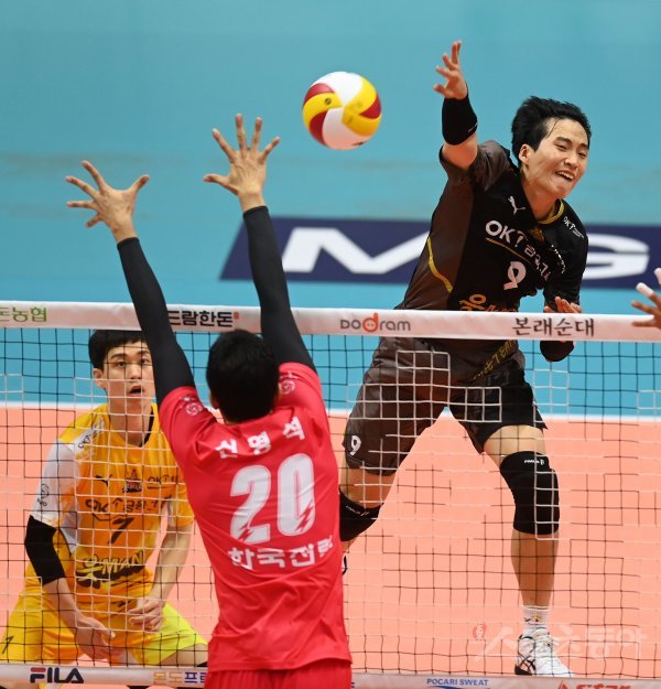 18일 경기도 의정부체육관에서 열린 ‘2021 의정부·도드람컵 프로배구대회’ 남자부 A조 한국전력과 OK금융그룹 경기에서 OK금융그룹 김웅비가 한국전력의 블로킹 사이로 스파이크를 있다.