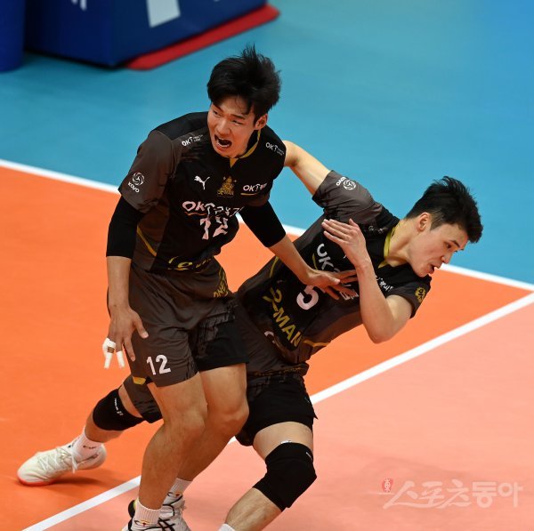 18일 경기도 의정부체육관에서 열린 ‘2021 의정부·도드람컵 프로배구대회’ 남자부 A조 한국전력과 OK금융그룹 경기에서 OK금융그룹 전병선(12번)과 권준형 수비 위치를 이동하다 충돌하고 있다.