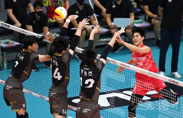 18일 경기도 의정부체육관에서 열린 ‘2021 의정부·도드람컵 프로배구대회’ 남자부 A조 한국전력과 OK금융그룹 경기에서 한국전력 김동영이 OK금융그룹의 블로킹 사이로 밀어넣기 공격을 있다.