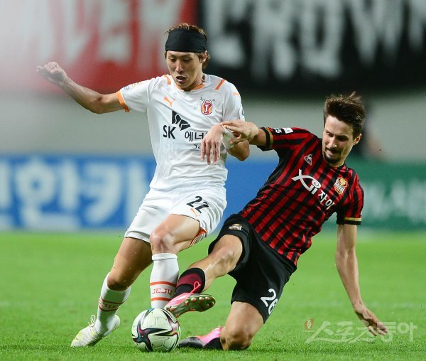 18일 서울월드컵경기장에서 열린 ‘하나원큐 K리그1 2021’ FC 서울과 제주 유나이티드의 경기에서 서울 팔로세비치가 제주 정우재를 향해 태클을 하고 있다.
