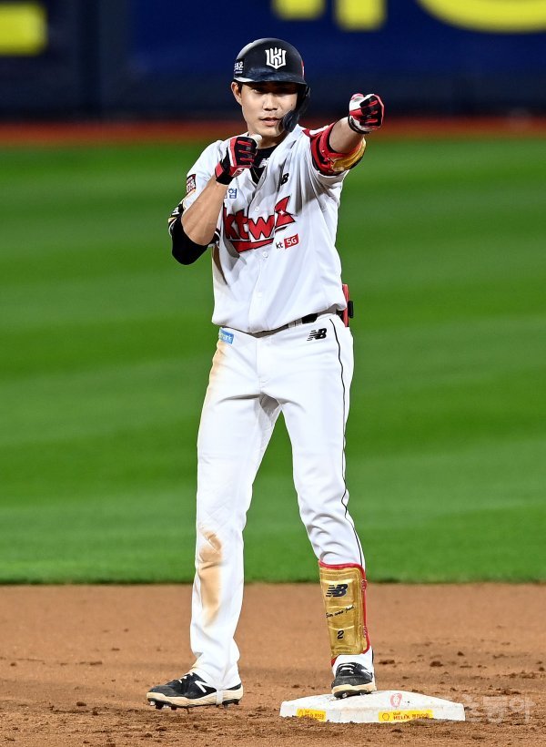 7회말 2사 1, 3루에서 kt 심우준이 1타점 2루타를 날린 뒤 세리머니를 펼치고 있다.