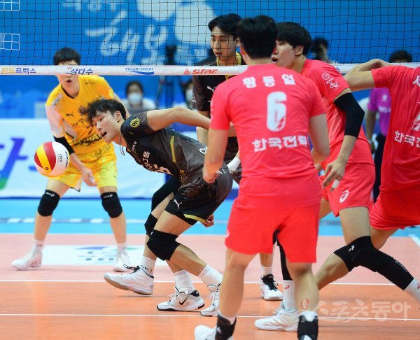 18일 경기도 의정부체육관에서 열린 ‘2021 의정부·도드람컵 프로배구대회’ 남자부 A조 한국전력과 OK금융그룹 경기에서 OK금웅그룹 최홍석이 리시브에 실패하고 있다.