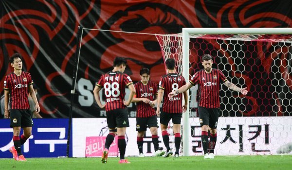 18일 서울월드컵경기장에서 열린 ‘하나원큐 K리그1 2021’ FC 서울과 제주 유나이티드의 경기에서 서울이 제주에 0-1로 패배한 뒤 선수들이 아쉬워하고 있다.