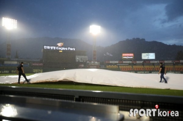 그런데 엉뚱한 곳에서 돌발변수가 나왔다. 이날 대전지역을 지나가던 요란한 비구름이 경기 진행을 막아선 것이다. 두 팀이 0-0으로 맞선 2회말 한화 공격 때 6번타자 백용환의 타석을 앞두고 경기가 중단됐다. 거세게 쏟아지는 소나기는 순식간에 그라운드를 적셨고, 내·외야의 흙을 ‘진흙’으로 만들었다. 심판진은 오후 7시3분 경기를 중단시켰다.