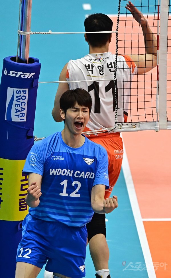21일 경기도 의정부체육관에서 열린 ‘2021 의정부-도드람컵 프로배구대회’ 남자부 결승전 서울 우리카드와 안산 OK금융그룹의 경기에서 우리카드 류윤식이 득점에 성공한 뒤 기뻐하고 있다.