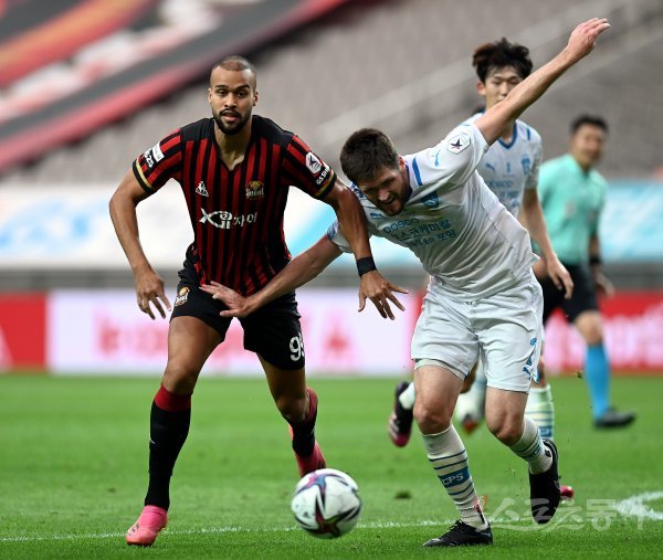 22일 서울 월드컵경기장에서 열린 ‘하나원큐 K리그1 2021’ FC 서울과 포항 스티러스의 경기에서 서울 가브리엘과 포항 그랜트가 볼 다툼을 벌이고 있다.