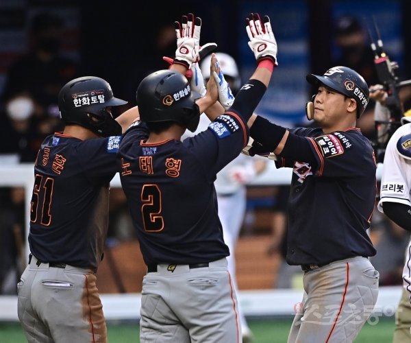 22일 서울잠실야구장에서 ‘2021 신한은행 SOL KBO리그’ 두산 베어스와 한화 이글스의 경기가 열렸다. 4회초 1사 만루 한화 하주석이 우월 만루 홈런을 쳐낸 뒤 동료들과 기쁨을 나누고 있다. 잠실 | 주현희 기자 teth1147@donga.com