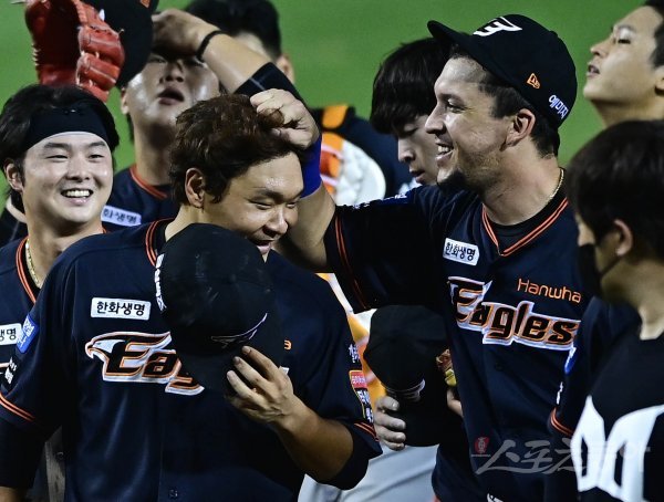 한화가 두산에 11-3으로 승리를 거둔 뒤 김태연과 페레즈가 기쁨을 나누고 있다.