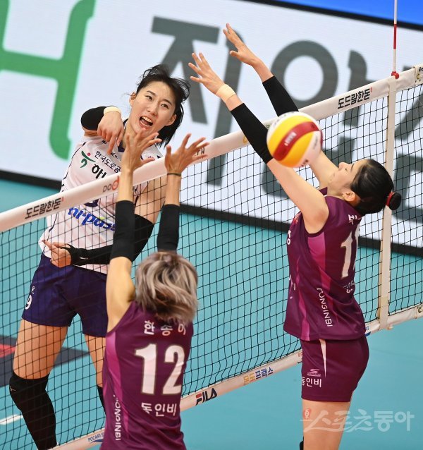 24일 경기도 의정부체육관에서 열린 ‘2021 의정부·도드람컵 프로배구대회’ 여자부 A조 KGC인삼공사와 한국도로공사 경기에서 한국도로공사 박정아가 KGC인삼공사의 블로킹 사이로 스파이크를 날리고 있다.