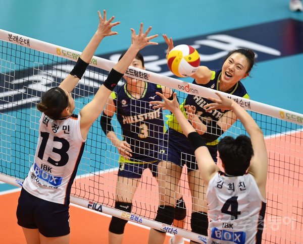 24일 경기도 의정부체육관에서 열린 ‘2021 의정부·도드람컵 프로배구대회’ 여자부 B조 현대건설과 IBK기업은행 경기에서 현대건설 양효진이 IBK기업은행의 블로킹 사이로 스파이크를 날리고 있다.