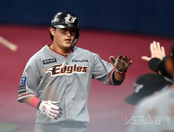 1회초 2사 2,3루 상황에서 키움 폭투 때 득점한 한화 장운호가 하이파이브 하고 있다.