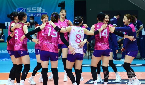 26일 경기도 의정부체육관에서 열린 ‘2021 의정부·도드람컵 프로배구대회’ 여자부 순위결정전 한국도로공사와 흥국생명 경기에서 세트스코오 3-1 승리를 거두며 준결승에 진출한 흥국생명 선수들이 기뻐하고 있다.